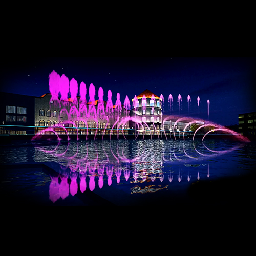 本案最大特色是以音乐喷泉、水幕电影激光秀、时光矩阵相结合为主题。水幕电影激光秀可以展现不同的主题风格,音乐喷泉可以展现多种造型水景,又加以时光矩阵的的搭配。使整个水秀充满科技感,沉浸感和丰富感。
